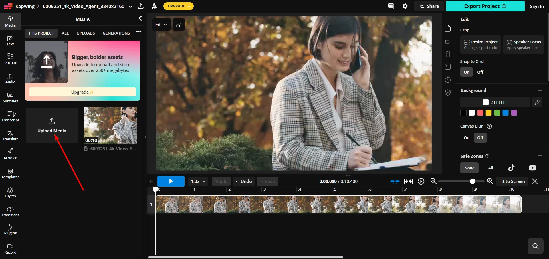 - В разделе «Media» на панели слева щелкните «Upload Media» и поместите ваши кадры на сайт. Щелкните по ним, чтобы они оказались на монтажной дорожке.