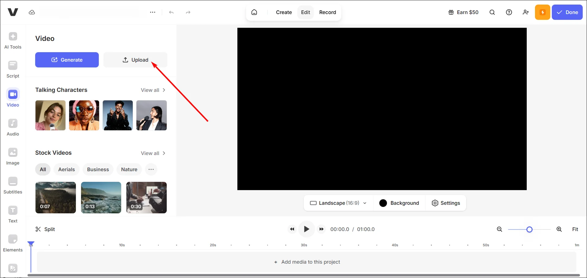 Veed.io использует искусственный интеллект, чтобы автоматически генерировать субтитры, очищать звук от шума, генерировать сценарии или даже оживлять виртуальных ведущих. Простой интерфейс позволяет легко обрезать клипы, накладывать эффекты, звуки и анимированный текст, а во встроенной медиатеке есть много стокового контента. Для работы на этом сервисе требуется регистрация. Подписка стоит от $9 в месяц. В пробной версии на проект накладывается водяной знак.
