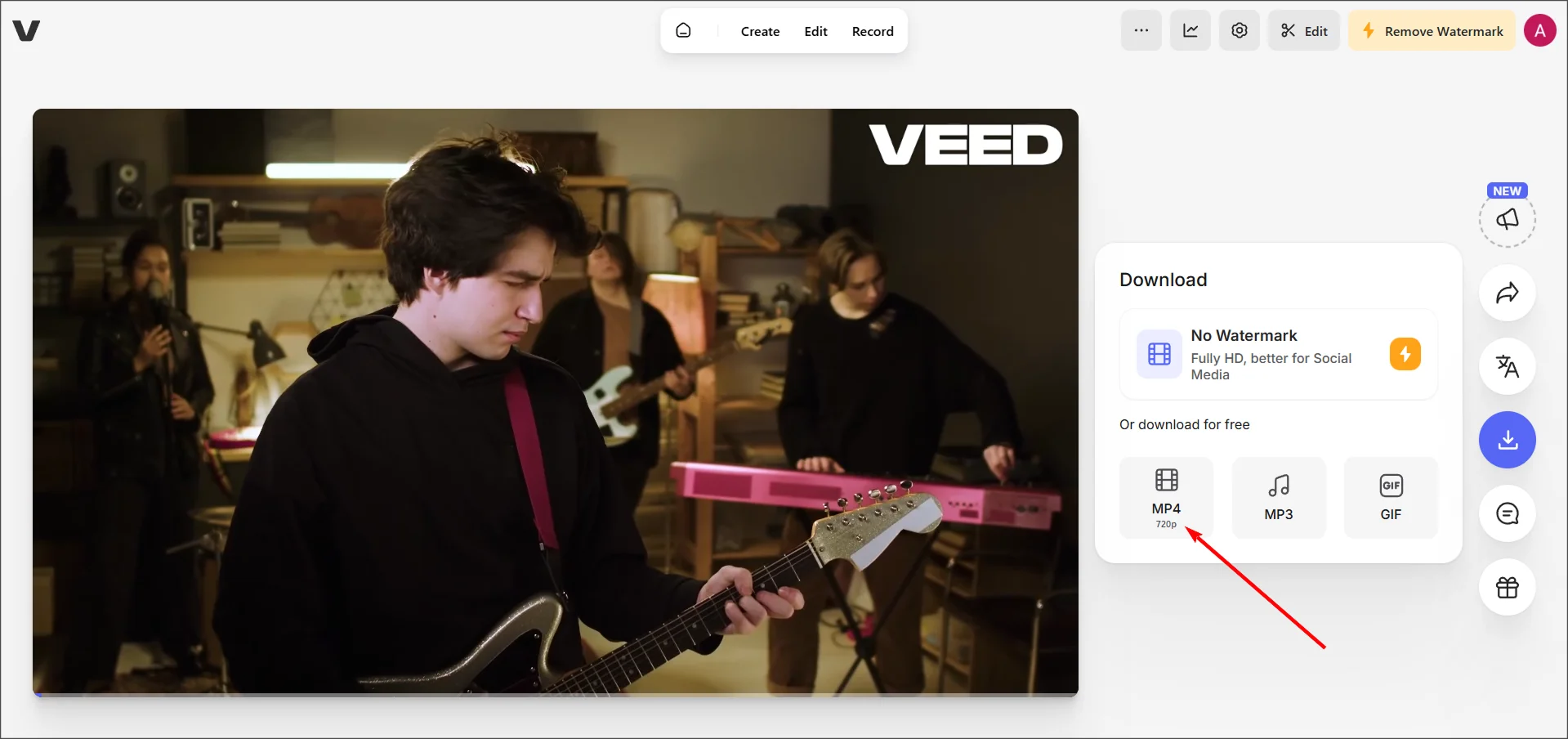 - Дождитесь прогрузки результата, щелкните иконку скачивания и выберите формат: MP3, GIF или MP4 в разрешении 720p.