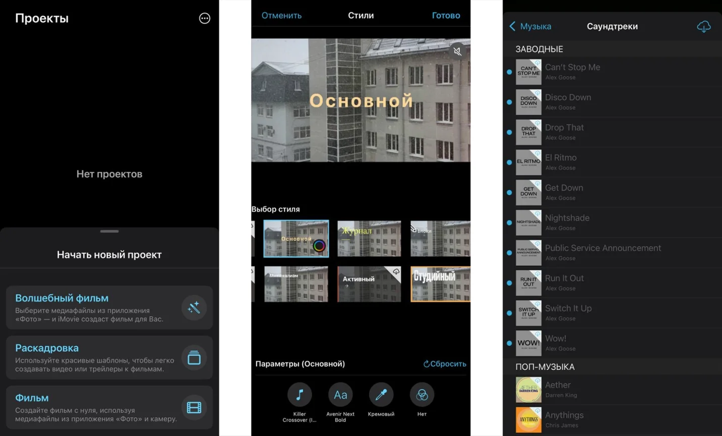 Это интуитивный видеоредактор для iPhone, который помогает собирать фильмы из ваших воспоминаний. Достаточно выбрать медиафайлы, и приложение автоматически создаст видеоролик с переходами, анимированными титрами и подходящей мелодией. В iMovie встроено 14 кинематографических шаблонов с профессиональной графикой и саундтреками. При этом доступен полный ручной контроль: настройка цветокоррекции, фильтров, режимы вроде «Картинка в картинке», добавление закадрового голоса.