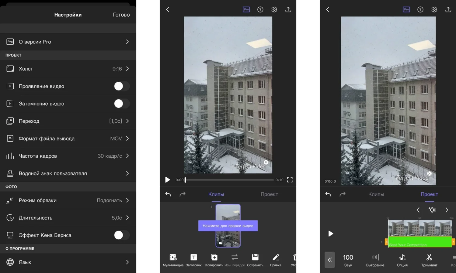 Видеоредактор с базовыми операциями. Позволяет делать обрезку, склейку, поворот, зеркальное отражение, ускорение или замедление фрагментов. В проект можно вставить текст, субтитры, водяные знаки, мозаику, фото или голосовое сопровождение. Доступны настройки переходов, громкости, фона и цветокоррекции. Pro-версия Perfect Video расширяет функционал: появляется хромакей, анимация по ключевым кадрам, пикселизация, выделение областей. Редактор работает с множеством форматов, позволяет быстро импортировать медиафайлы и объединять их.