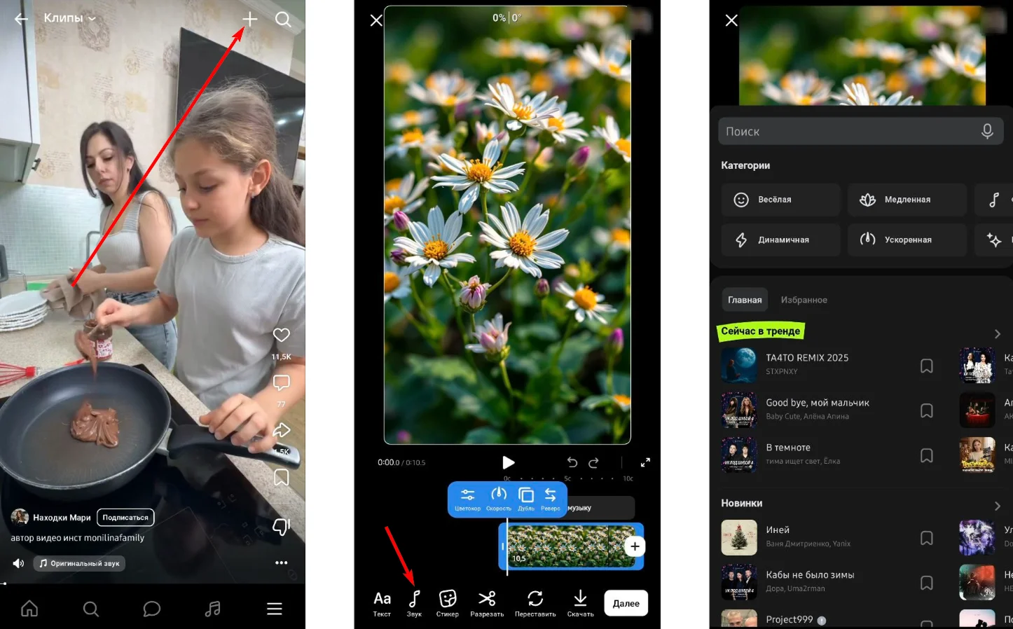 - В нижней части тапните вкладку «Звук» — там вы найдете встроенную аудиобиблиотеку и сможете загрузить свою песню.