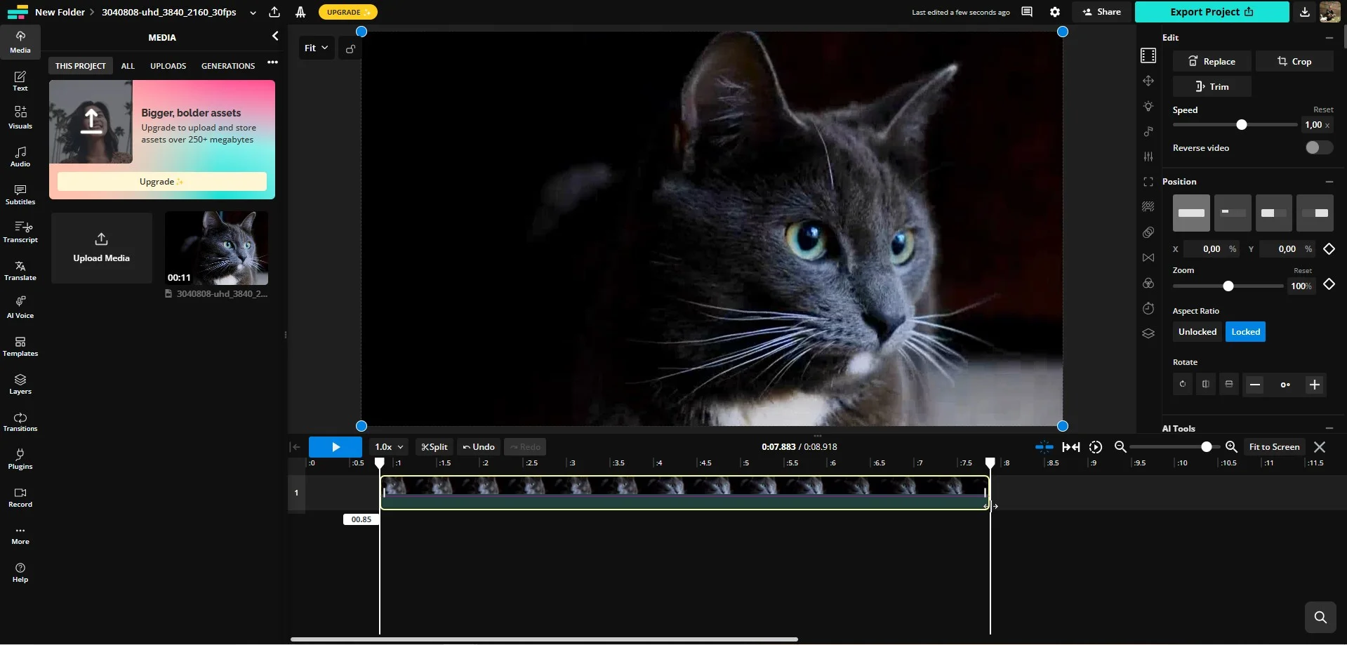 Продвинутый веб-редактор располагает стандартными инструментами для монтажа и AI-функциями. Вы сможете создать из своей видеозаписи клип для соцсетей, используя шаблоны, добавить к нему титры или сделать озвучку. Можно даже быстро сгенерировать видеомем с помощью функции «Smart Cut». Но есть небольшое неудобство — нельзя переключить меню на русский язык, а при использовании браузерного переводчика возможны сбои. Так что потребуется базовое знание английского.
