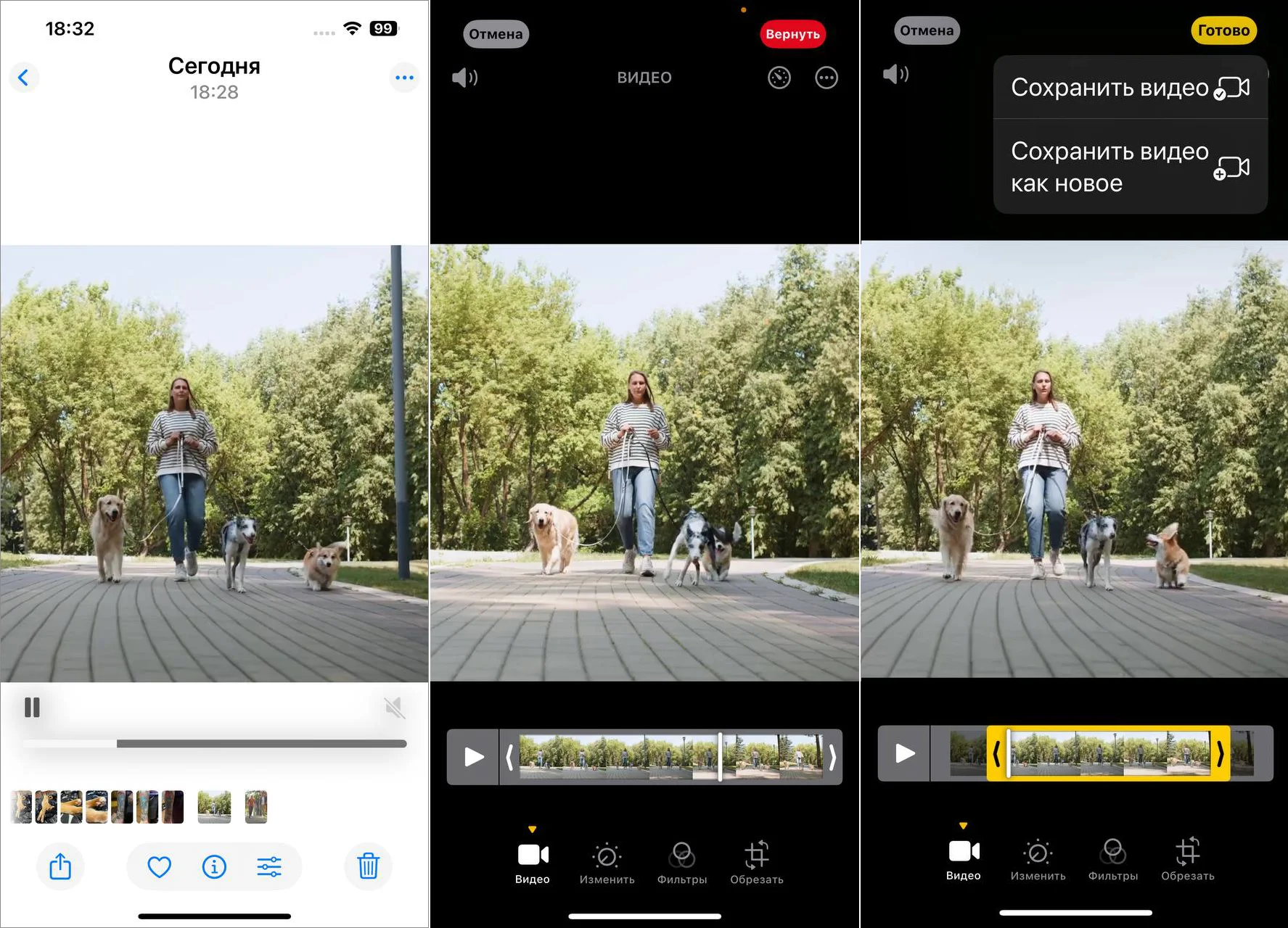 В iOS при обрезке ролика непосредственно в галерее вашего смартфона вы можете выбрать: сохранить текущий файл видео обрезанным или создать новое, уже обрезанное, видео. Также для обрезки хорошо подходят приложения для монтажа. Они не только могут сократить длительность вашего видео, но и при пересохранении ролика через них уменьшат объем памяти, который занимает видео в галерее смартфона. Такой лайфхак по освобождению места хорошо подходит, когда у вас есть длинные «тяжелые» видеофайлы.