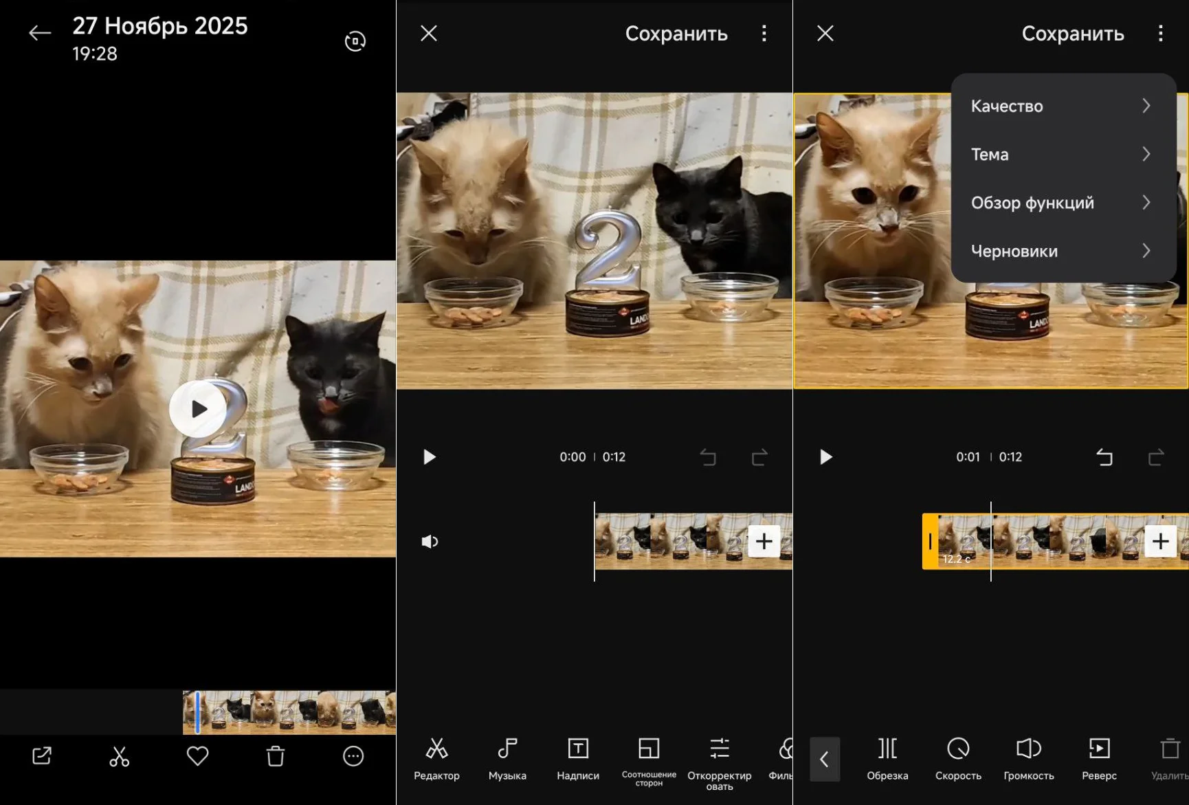 Возможности приложения Галерея на телефонах Андроид могут отличаться, в зависимости от марки и модели телефона. На одних смартфонах вы сможете улучшить картинку и укоротить клип, в других вы также сможете разделить аудио и видеодорожку, и заменить исходный звук на фоновую музыку, настроить скорость.