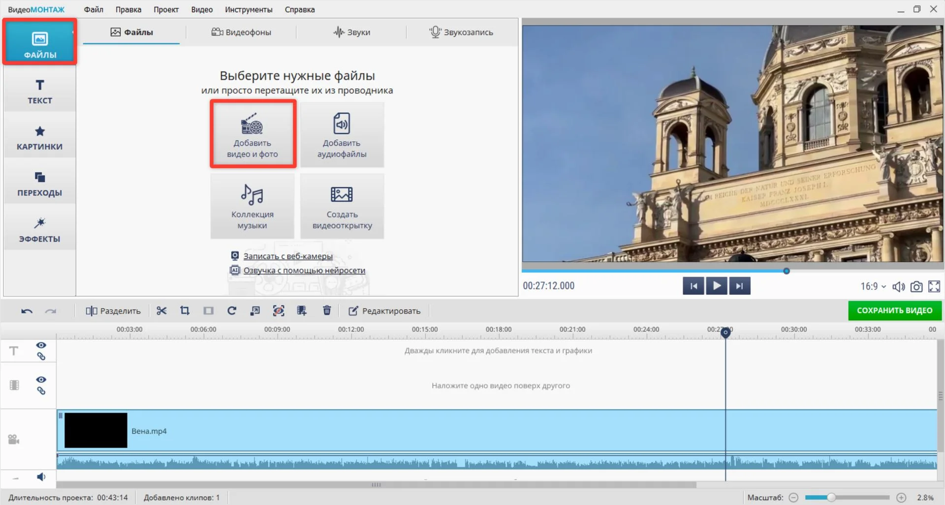 После этого экспортируйте ролик, нажав кнопку «Сохранить видео». Если остались вопросы по работе с программой, посмотрите подробный урок с пошаговой инструкцией.