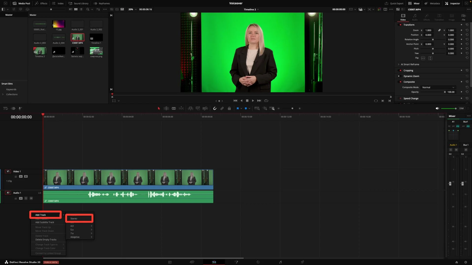 - Подготовьте новую дорожку, в которой будет фиксироваться ваш закадровый голос. Для этого правой кнопкой мыши нажмите «Add Track» → «Stereo».