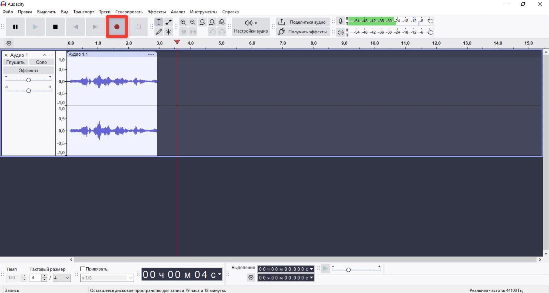 - Выберите «Запись» и кликните красную кнопку. Начните работу, после чего остановитесь и прослушайте результат.