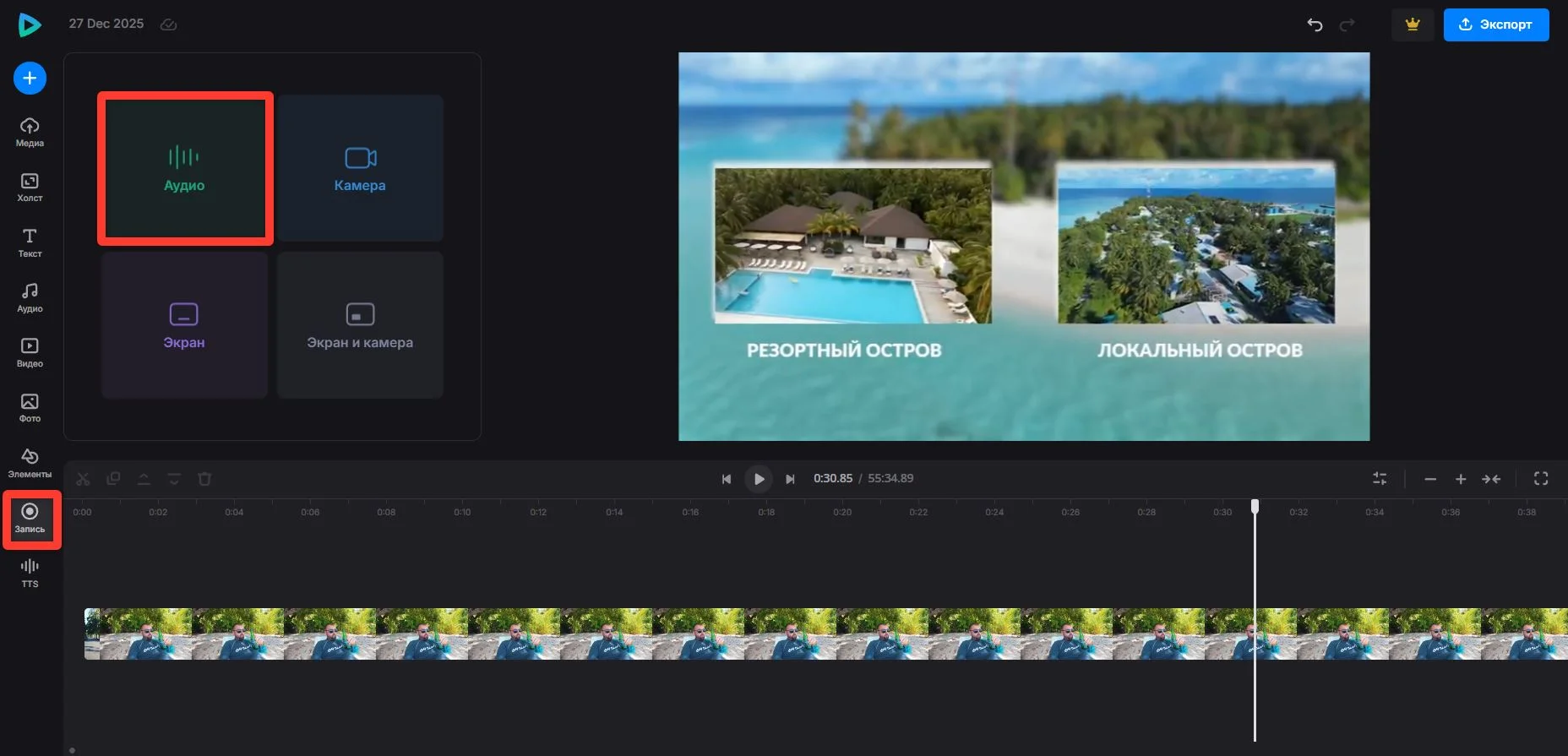 - Нажмите голубую кнопку и начните работу. Остановитесь в определенный момент, настройте громкость через ползунки. Экспортируйте готовый контент в нужном разрешении и сохраните в галерею.