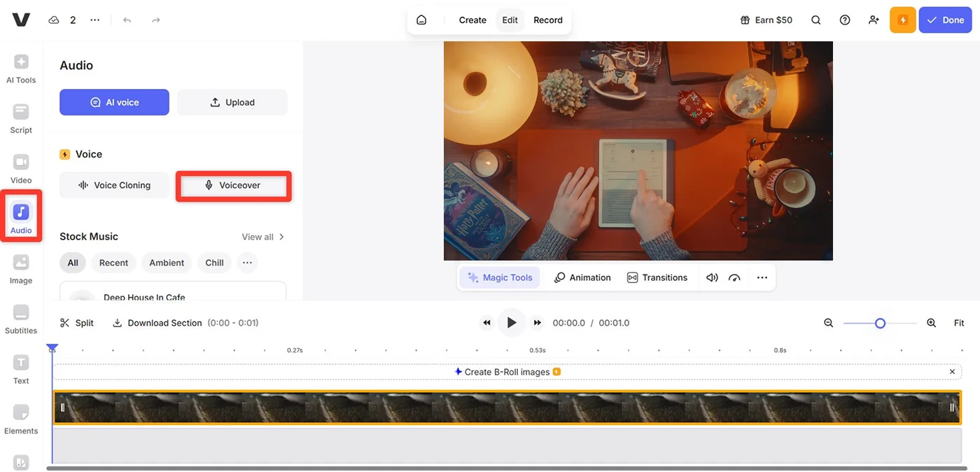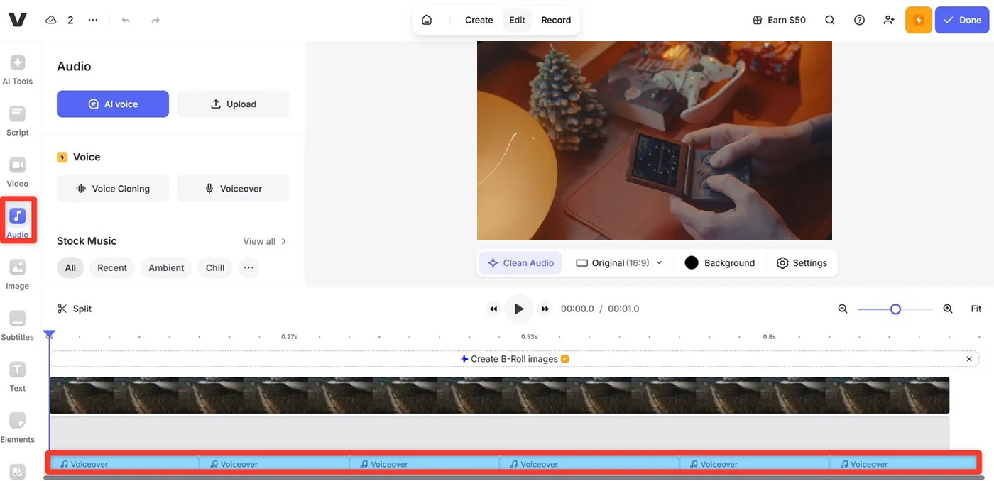 - Создайте новый проект и загрузите видеозапись. Перейдите в раздел «Audio» на левой панели и выберите «Voiceover».
