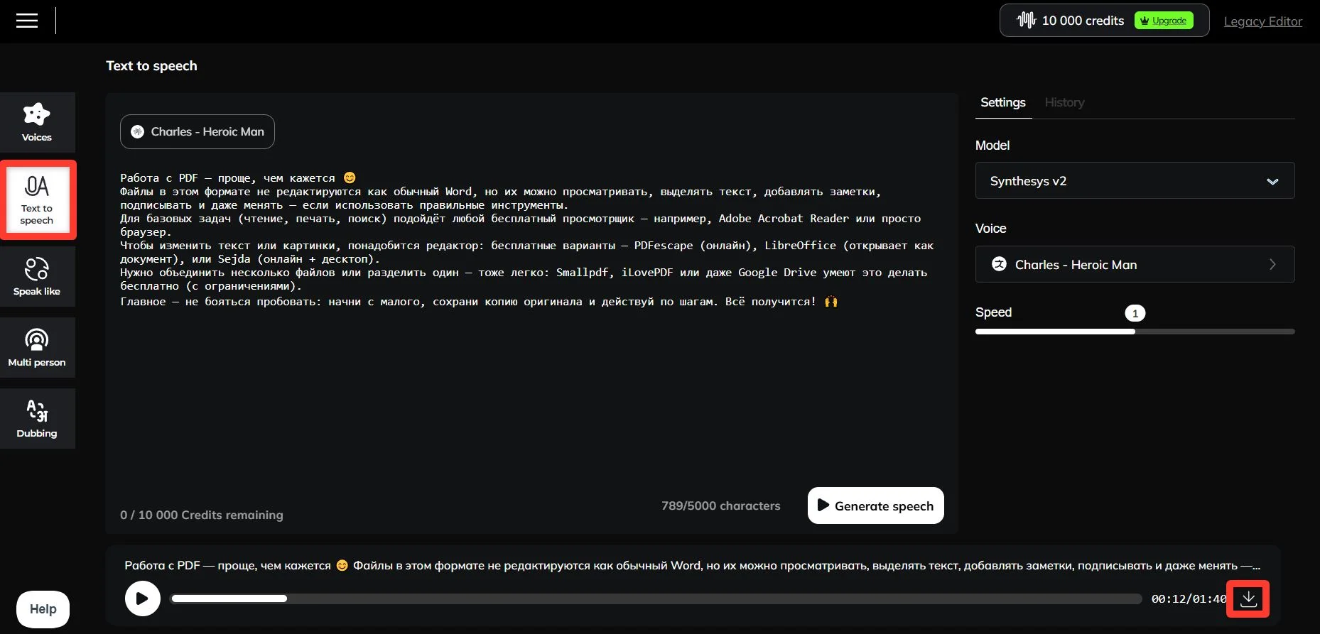- Вставьте текст в редактор в блоке «Text to speech», выберите подходящий голос из списка доступных вариантов. После генерации скачайте аудиофайл. Его можно будет добавить в ваш клип.