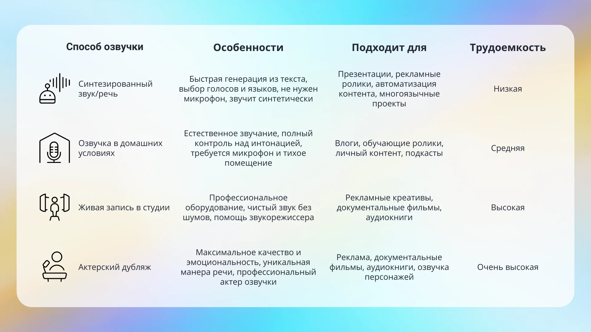 Выбор инструмента для озвучки зависит от ваших задач и опыта. Десктопный софт подходит для серьезных проектов, онлайн-сервисы выручают при быстрой работе без установки софта, а приложения позволяют делать контент прямо на ходу. Нейросети существенно экономят время.
