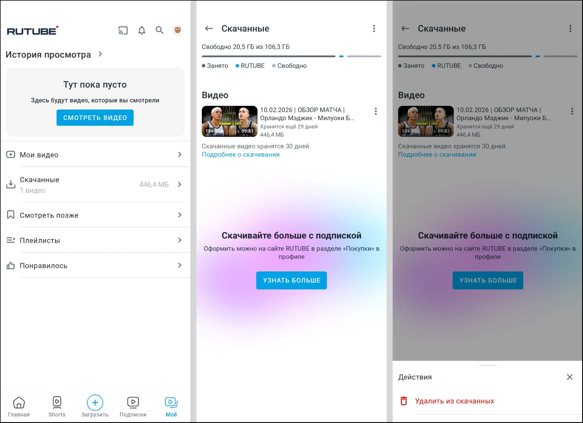 - Приложение Rutube для Android — в мобильной версии хостинга предусмотрена кнопка для скачивания. Материал хранится в разделе «Мое» до 30 дней. Без подписки можно сохранять до одной видеозаписи максимум.