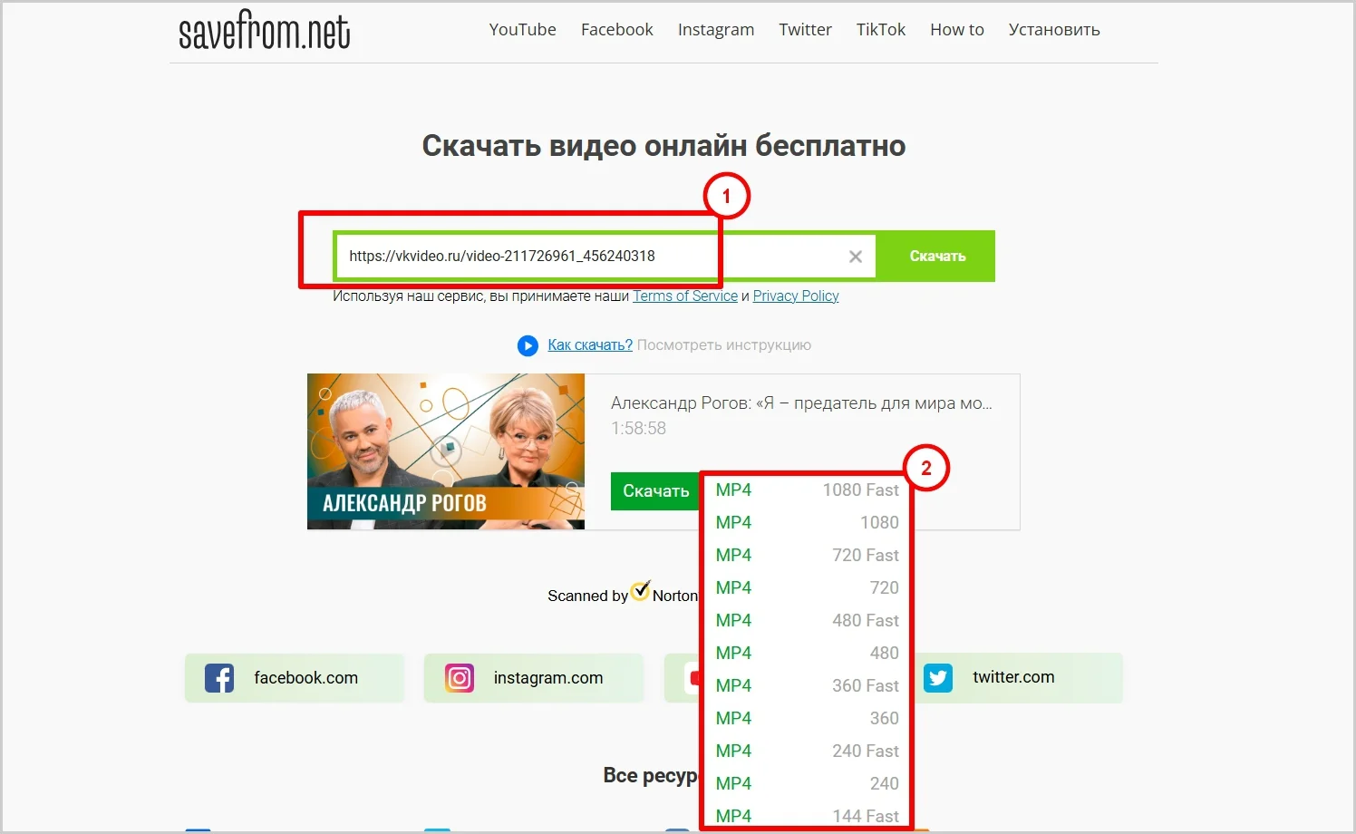 На смартфоне — тапните три точки справа над роликом. - Введите URL в специальное поле на сайте Savefrom.
