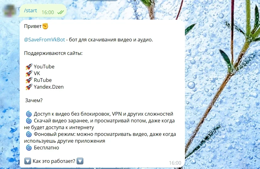 Бот скачивает видеозаписи и аудио из VK, Rutube, Дзена, YouTube. Подписываться на сторонние каналы не нужно.