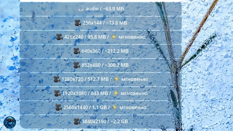 - Дождитесь, пока сервис обработает URL-ссылку и предложит варианты. Выберите необходимое качество. Файл в MP4 экспортируется в папку «Загрузки» вашего устройства.