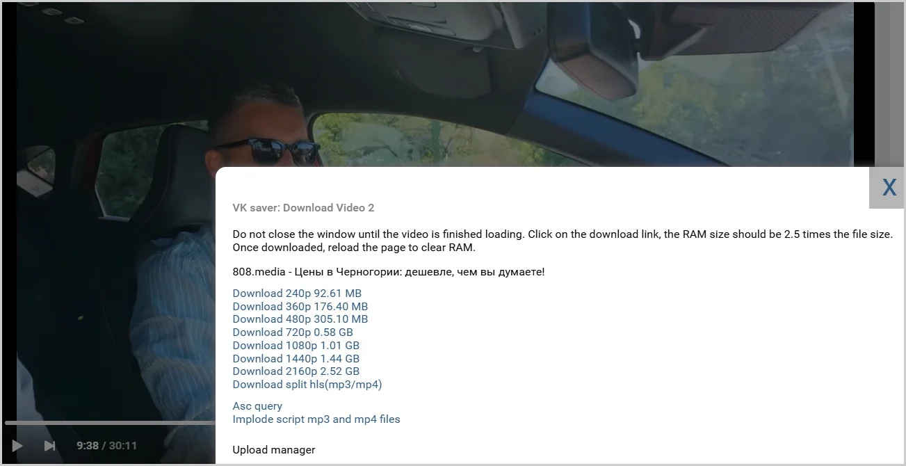 Перед экспортом дается небольшая инструкция, например, пока видеоролик не загрузится полностью, окно ВКонтакте нельзя закрывать. Также через плагин можно загружать фрагментированные записи HLS (HTTP Live Streaming) в форматах MP3 или MP4.