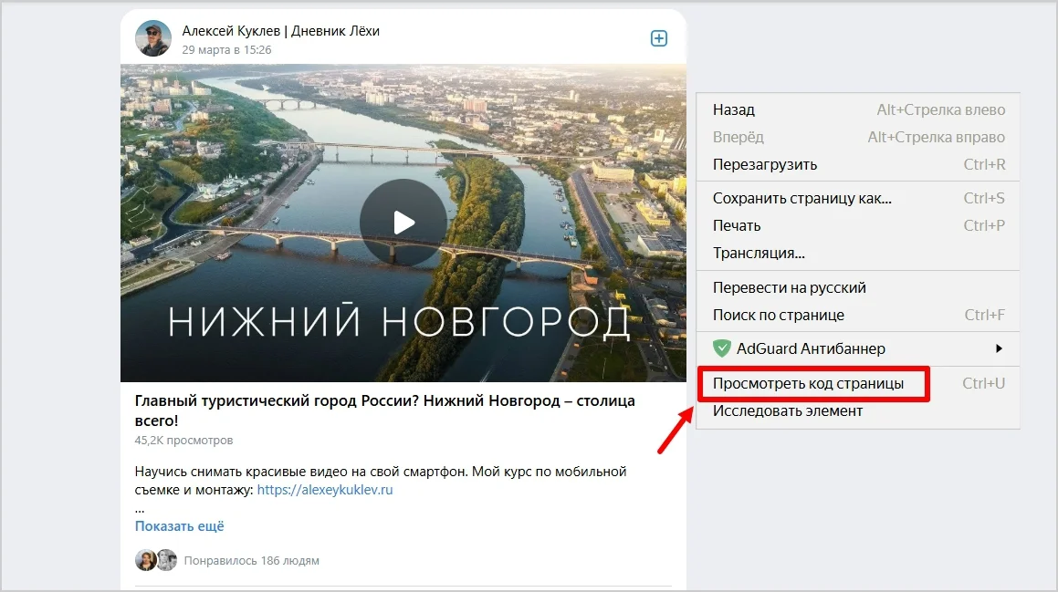 Этот метод не требует установки ПО — достаточно браузера и панели разработчика. Будем искать ссылку в коде страницы. Инструкция подходит для любых браузеров.