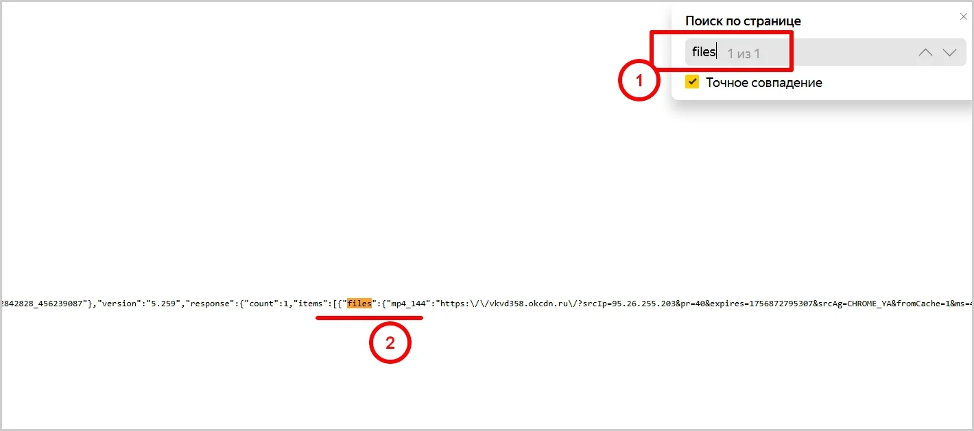 Введите в поисковую строку слово «files». - В результатах поиска найдите ссылку, содержащую параметры разрешения (например, mp4_144, mp4_240, mp4_1080). Чем больше число — тем выше разрешение. Скопируйте адрес, начинающийся с https:// и заключенный в кавычки.