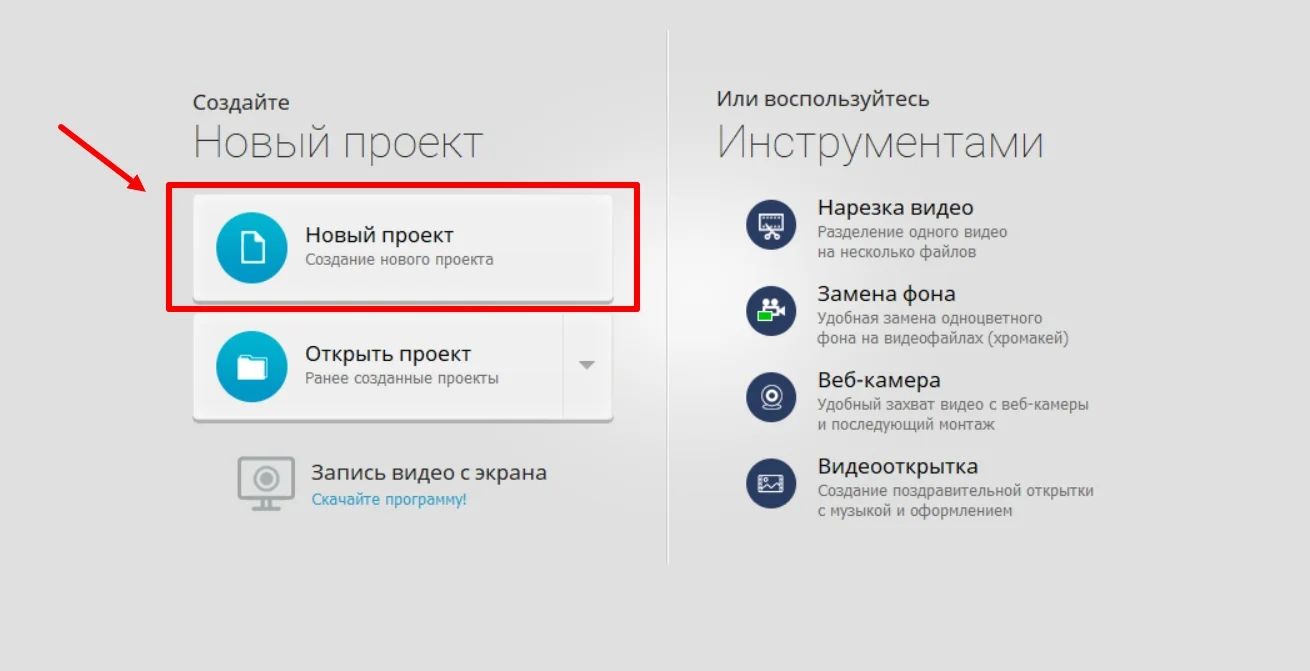 - Откройте программу и щелкните «Новый проект» → «Проект с нуля». Также вы можете использовать отдельные инструменты из списка с правой стороны: например, только заменить фон или нарезать видеоряд.