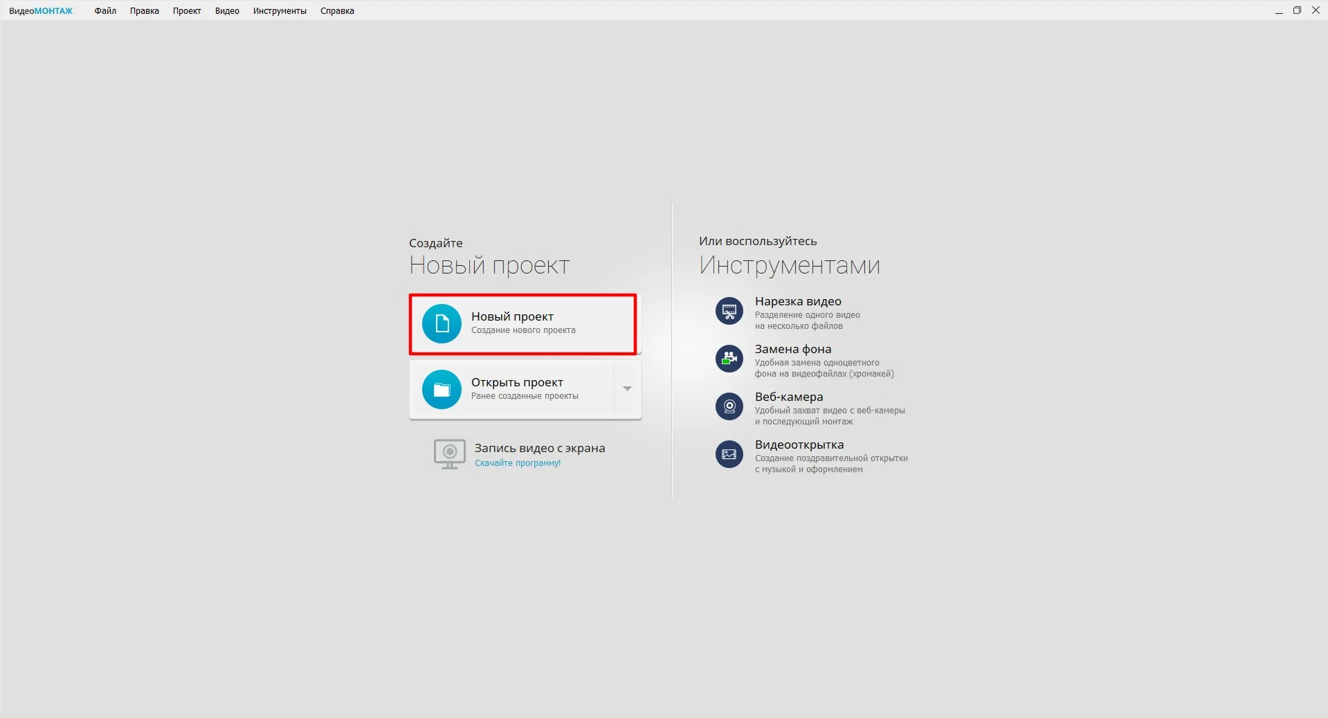 - Скачайте и установите софт на ПК. Запустите программу и выберите «Новый проект».