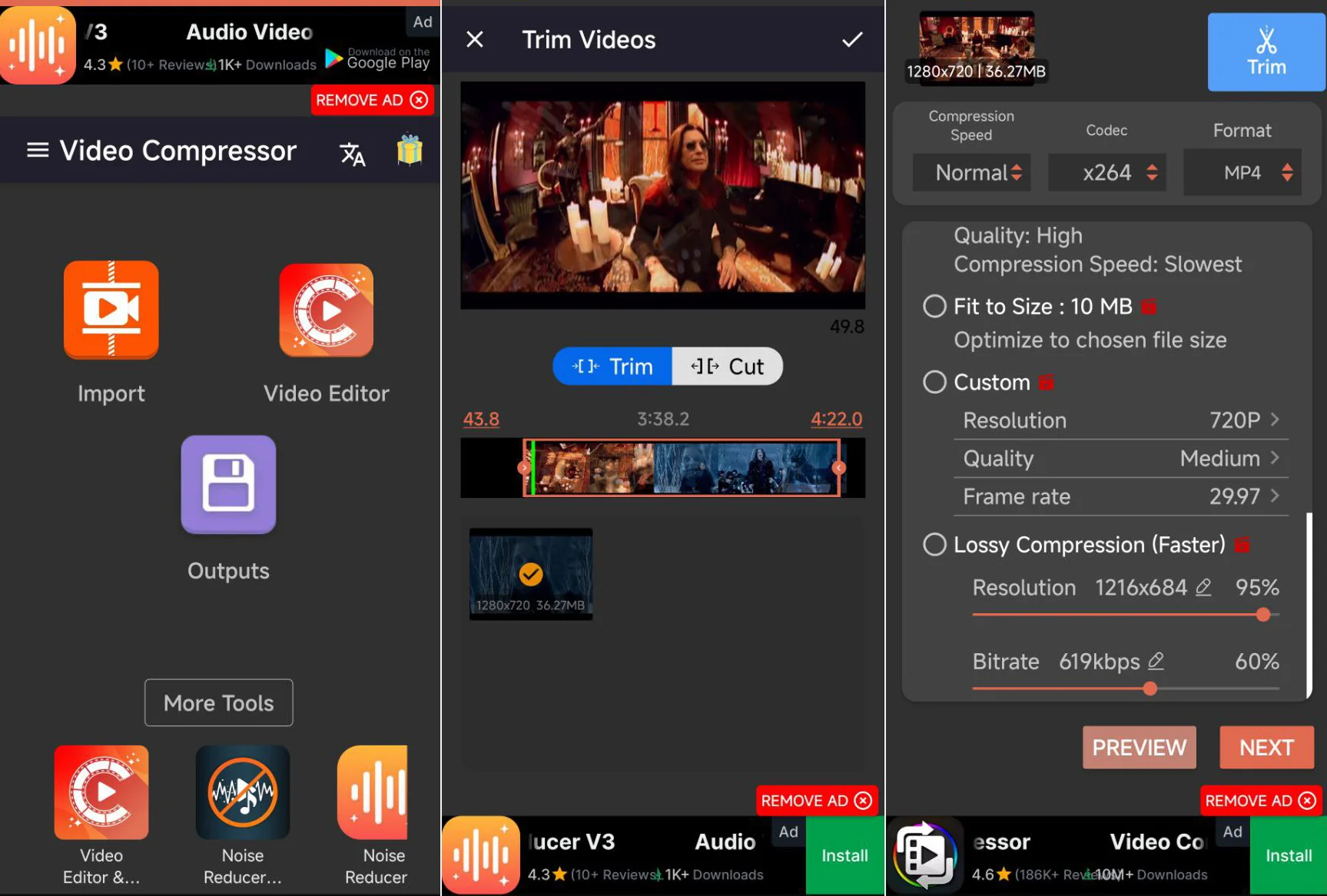 Приложение отличное. Но без подписки функционал очень ограничен — по факту, доступно только двукратное сжатие с предустановленными параметрами. К тому же мешает реклама — баннеры на рабочем экране, ролики, которые приходится смотреть между операциями.
