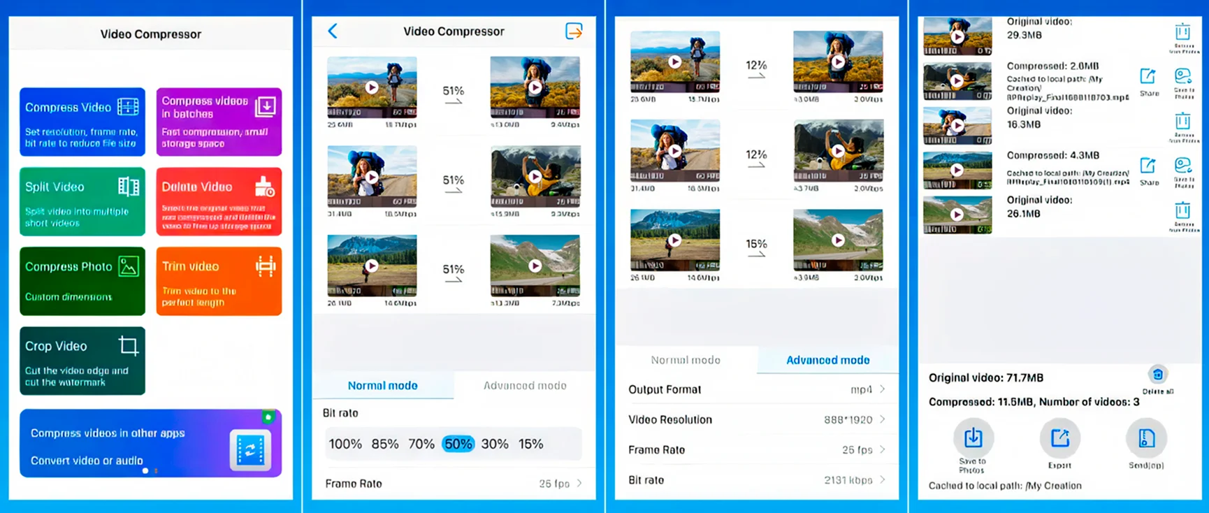 Мобильный компрессор быстро уменьшает видеофайлы с минимальными потерями. Предлагает два режима — быстрый (выбор процента сжатия) и расширенный (с пользовательскими настройками).