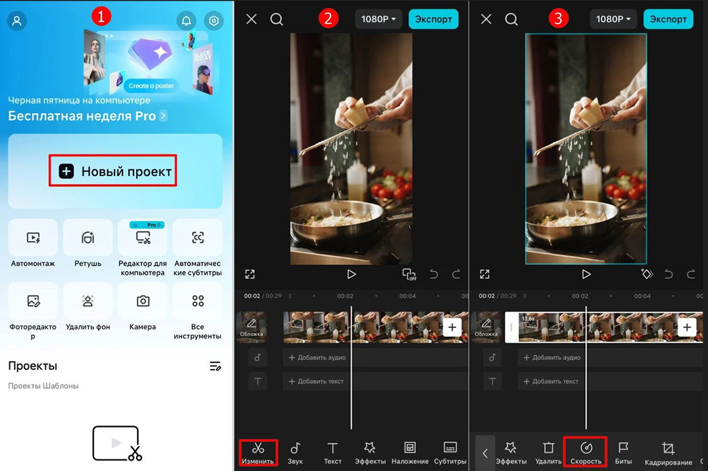 Приложение CapCut можно установить на айфоны и смартфоны Андроид. Мобильная версия предлагает интуитивно понятный интерфейс, оптимизированный для сенсорного управления, и полный набор функций, включая гибкие настройки скорости. Это делает видеоредактор идеальным выбором для блогеров и авторов, которые монтируют ролики, снятые на телефон, и сразу выкладывают их в сеть.