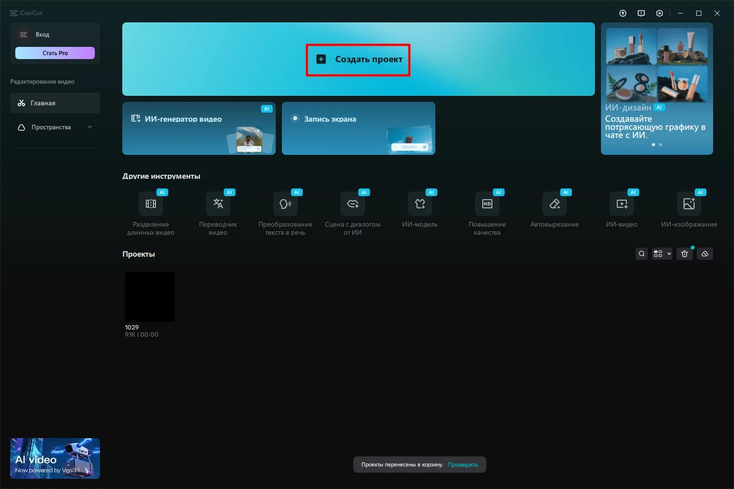 - Запустите редактор. В стартовом окне выберите «Создать проект».