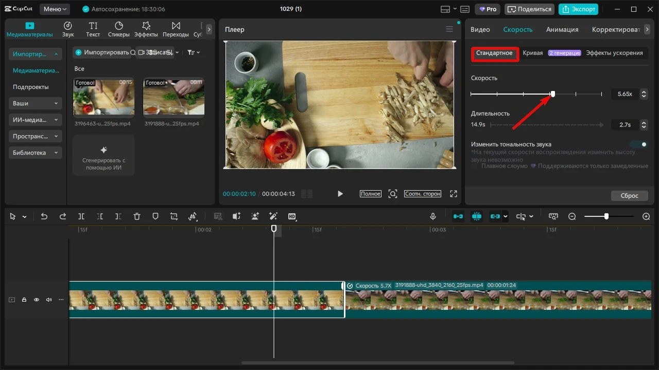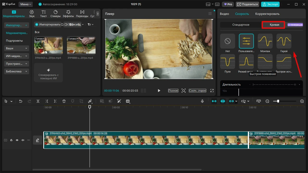Монтаж на большом экране также более удобен, когда нужно точно выстраивать график кривой скорости. Подготовили краткую инструкцию, как ускорить видео в Кап Кут на ПК.