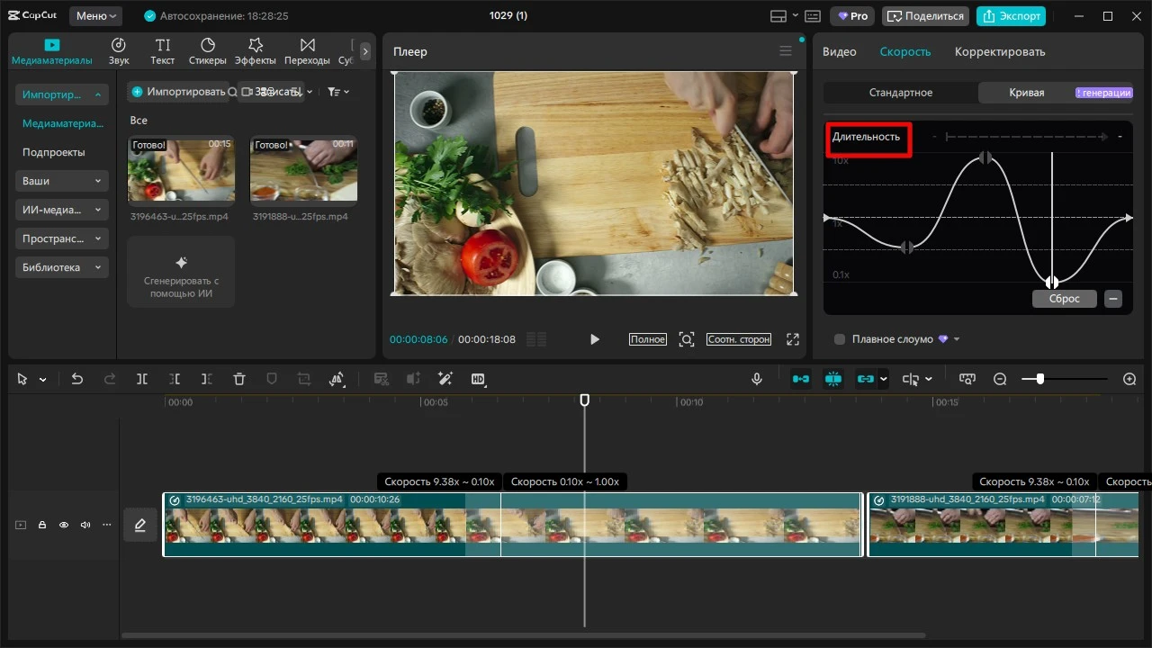 - Если хотите самостоятельно настроить, как изменить скорость видео в CapCut, нажмите «Пользовательская». В окошке «Длительность» постройте свой график смены скорости.