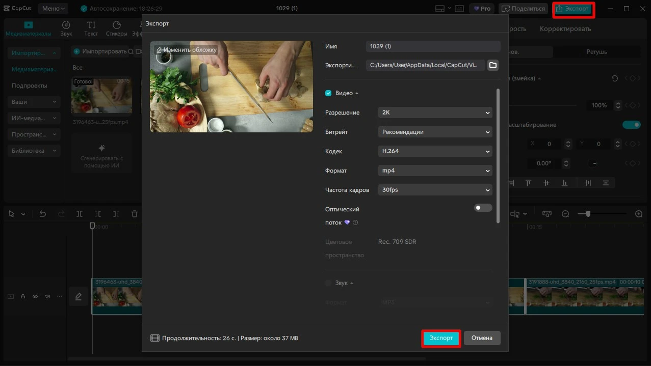 - Сохраните результат. Настройте разрешение, частоту кадров и другие параметры и тапните на «Экспорт».