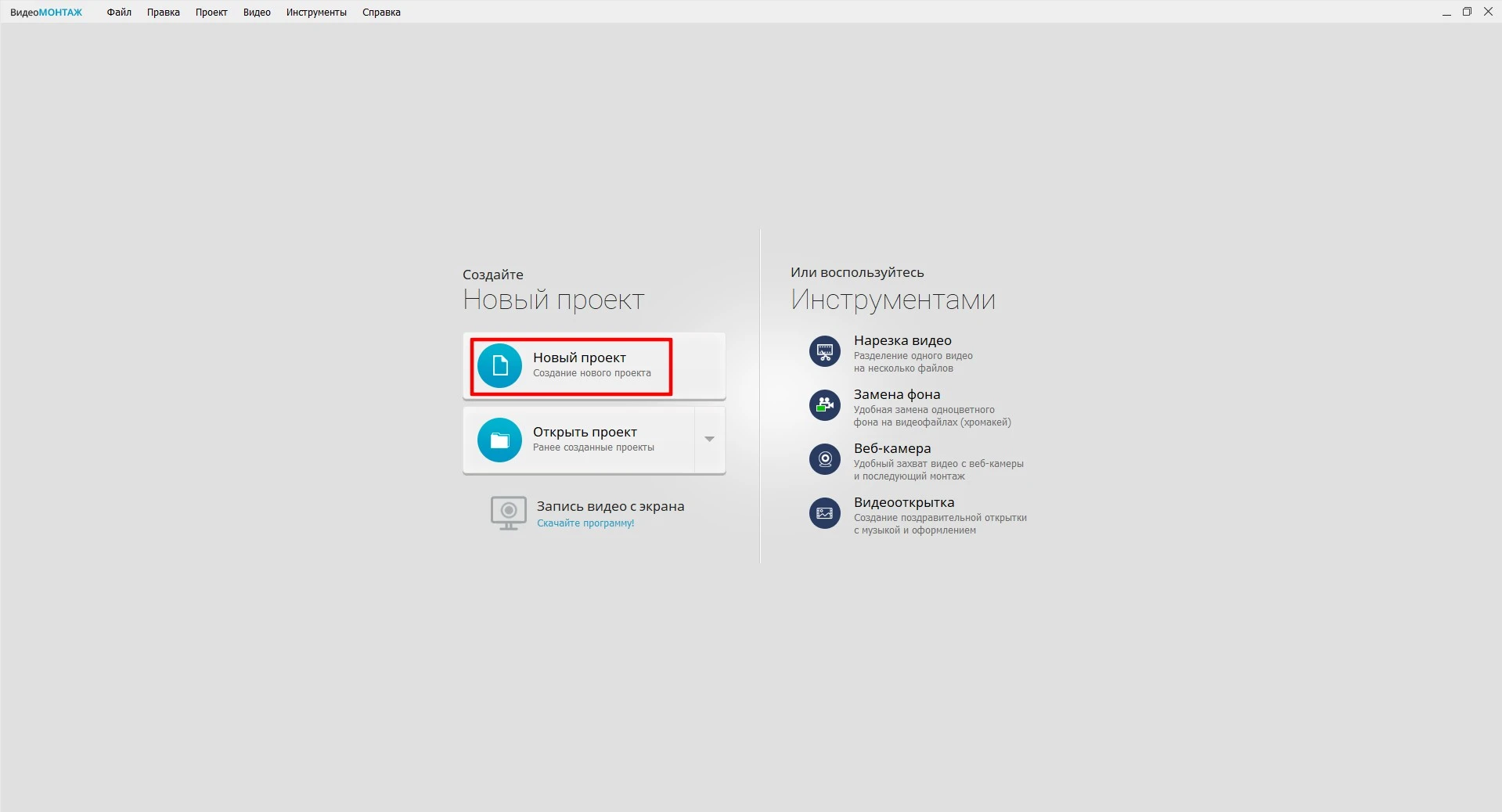 - Скачайте и установите видеоредактор. Запустите программу и создайте проект с нуля.