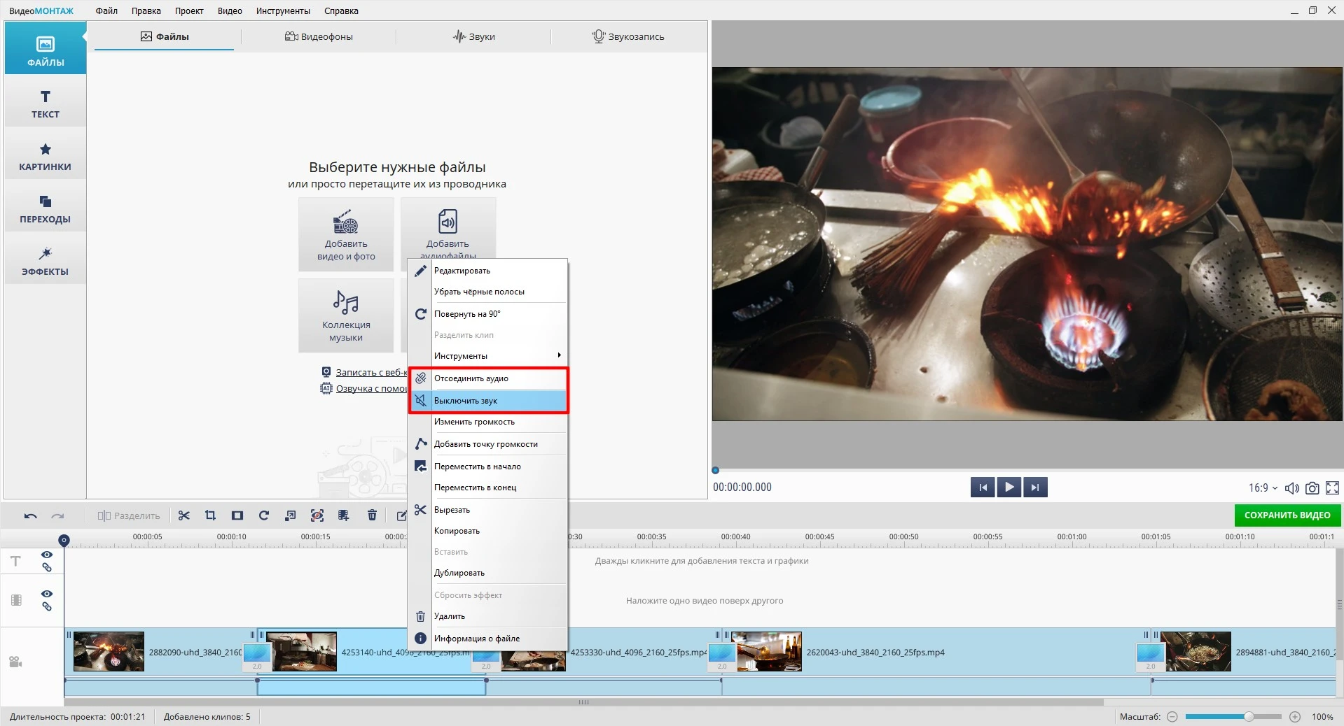- Важный момент: если вы хотите применить эффект ускорения только к визуальному ряду, но звук оставить оригинальным, нужно предварительно отделить аудиодорожку или отключить ее. Выделите фрагмент, на котором будете менять скорость, и кликните правой кнопкой мыши. Выберите «Выключить звук» или «Отделить аудио».