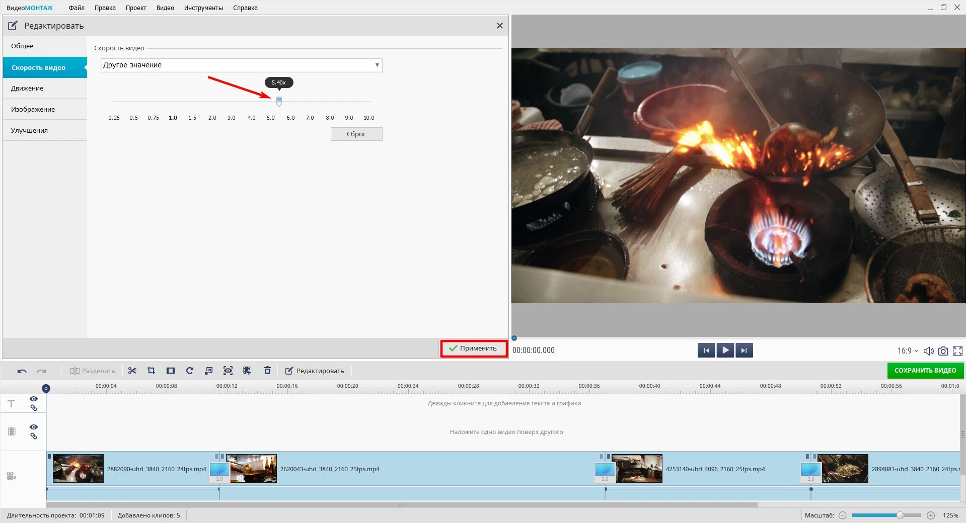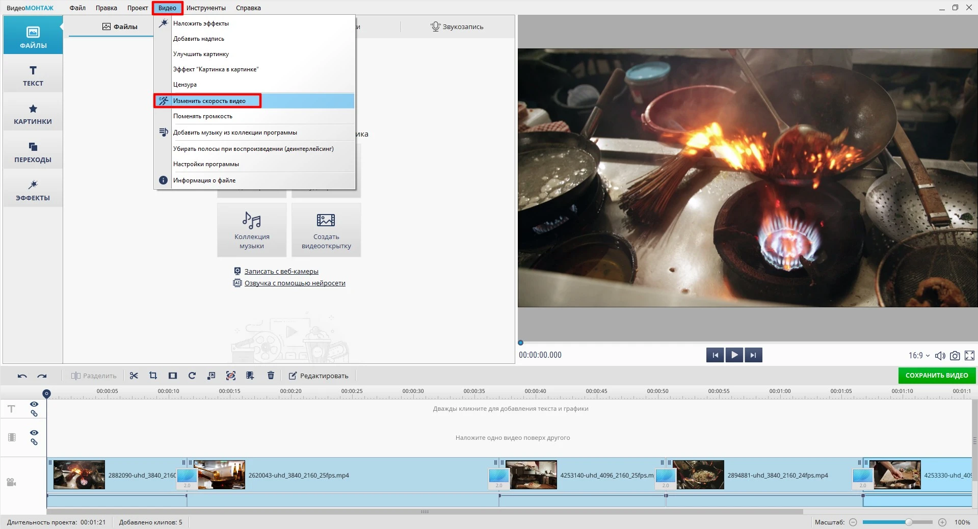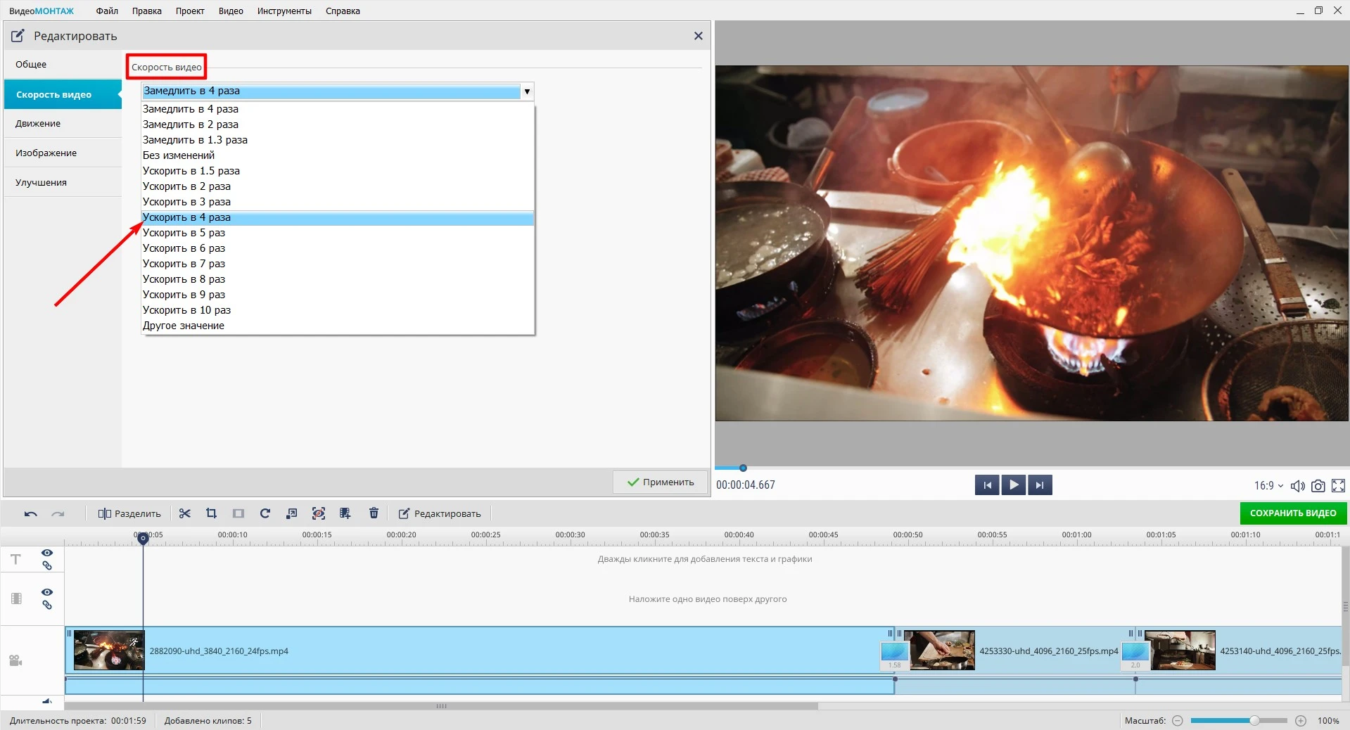 Изменить скорость клипа или его отдельных отрезков можно в несколько кликов. Покажем, как это делать, в обучающем видео.