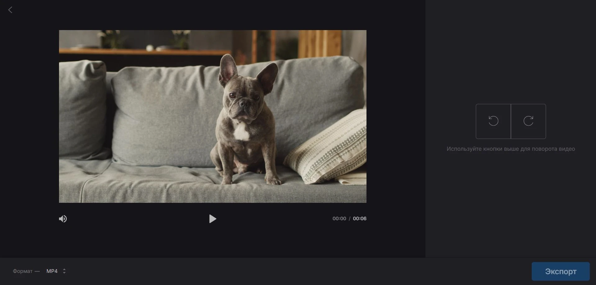 Сервис предлагает 45+ опций для работы с видеороликами: обрезка, склейка, создание видеоклипа с музыкой и фильтрами, наложение субтитров и другие. Поворот реализован в отдельном плеере, также, как и все другие опции. Здесь всего две кнопки: поворот влево и вправо.