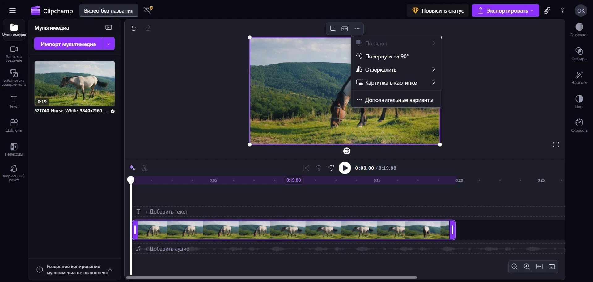 - Загрузите видео, на таймлайне кликните стрелку «Повернуть клип на 90°» и сохраните результат.