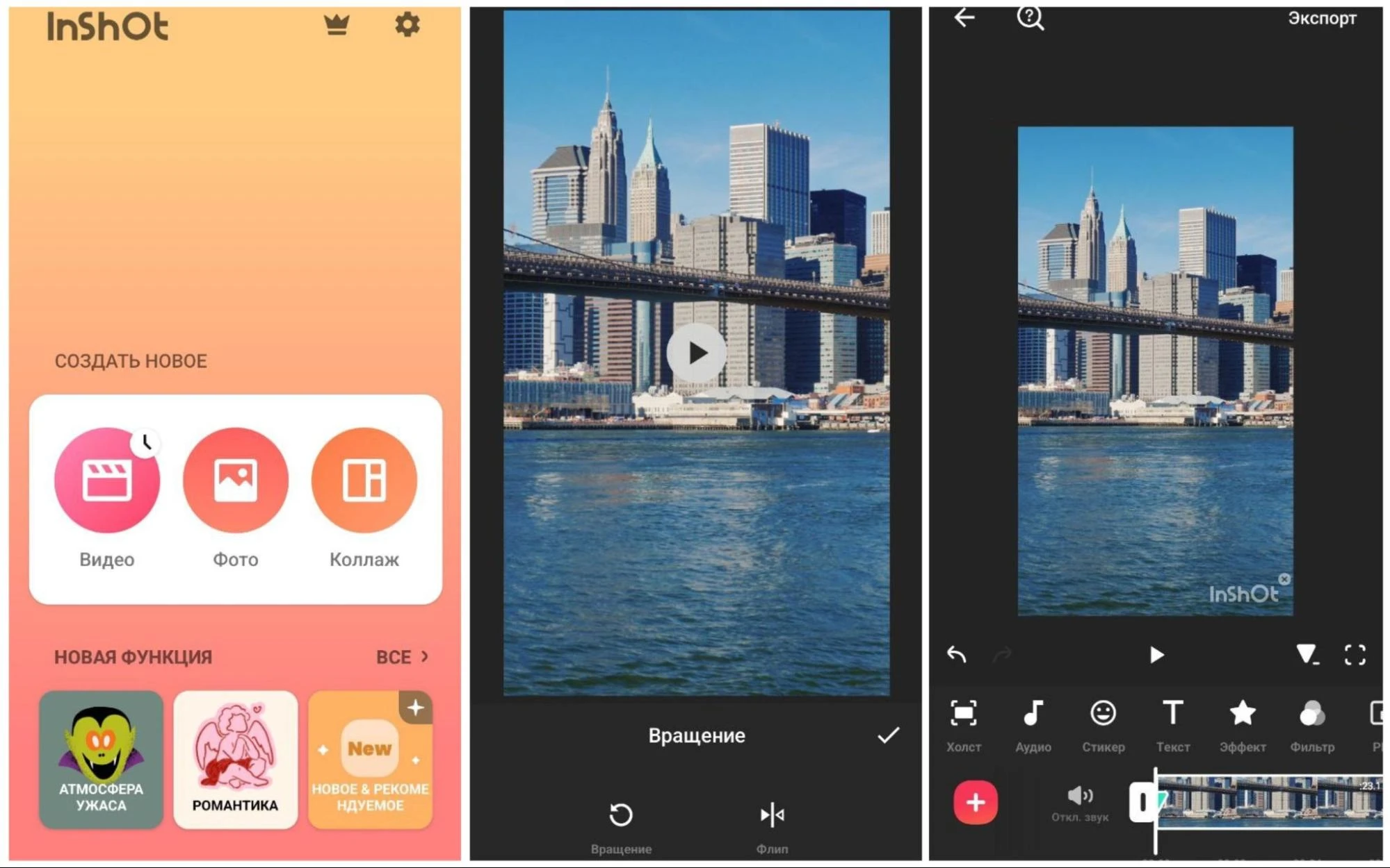 InShot — это мобильное ПО для редактирования видеороликов и фото. Меню простое: внизу экрана — таймлайн, а рядом все кнопки. На рабочем столе легко добавить музыку, стикеры, эффекты или анимированный текст. Здесь также есть опция поворота кадра и его отражение.