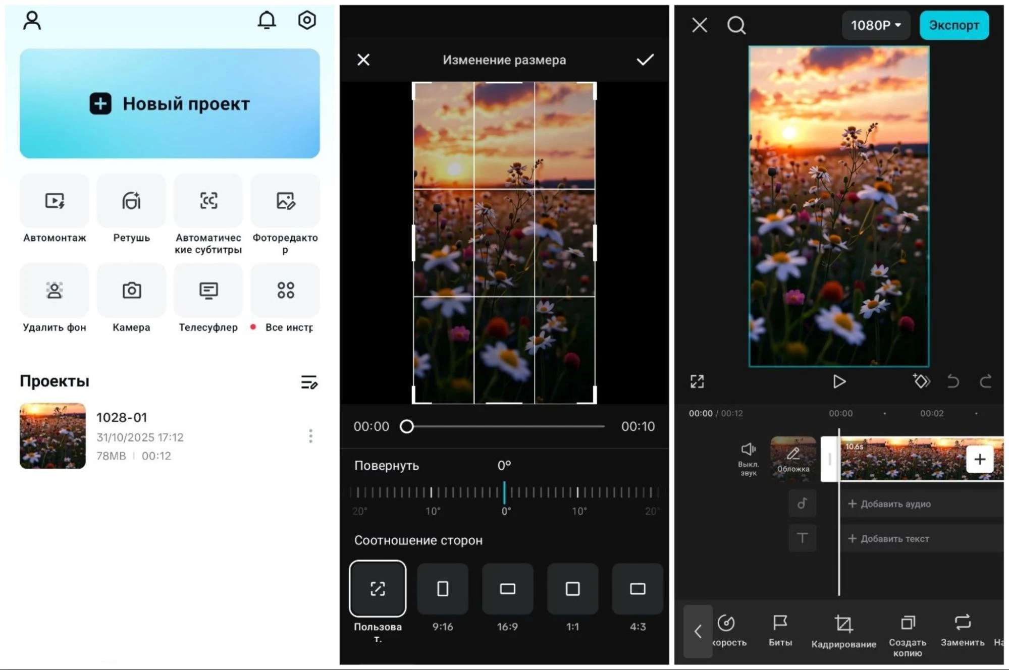 CapCut и InShot — отличный выбор для быстрого монтажа на смартфоне: с ними удобно поворачивать видеоролики, добавлять эффекты и музыку на ходу. А 123apps или Clideo подойдут для разового использования без установки — просто загружаете в браузер, редактируете и скачиваете готовое.